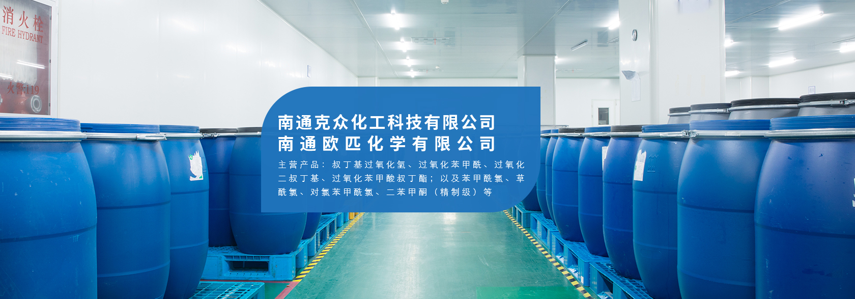 南通克眾化工科技有限公司暨南通歐匹化學有限公司是有機過氧化物、酰氯系列及基礎化學品的專業供應商。 有機過氧化物:過氧化苯甲酸叔丁酯、過氧化苯甲酰、過氧化二叔丁基、叔丁基過氧化氫、2,5-二甲基-2,5-雙(叔丁基過氧基)己烷、過氧化雙(2,4-二氯苯甲酰)等,共計5000噸/年。